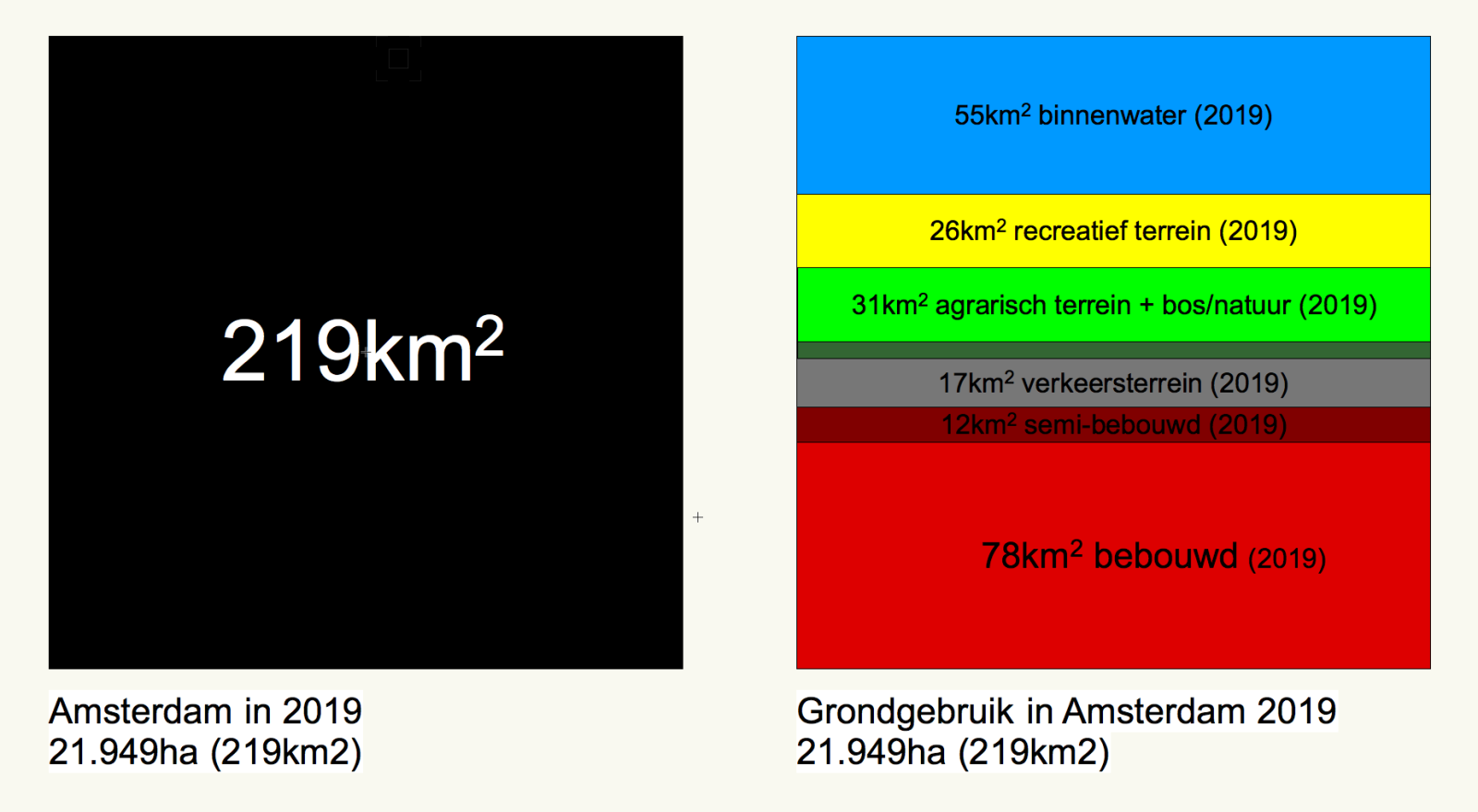We gaan van 56 naar 72 km2, zo wordt gesteld. Dat is knap, want volgens de dataset grondgebruik uit 2019 is Amsterdam 219 km2 groot. 72 km2 is bijna één derde van Amsterdam. We kijken eerst even naar het grondoppervlak van Amsterdam, op basis van getallen van de gemeente Amsterdam uit 2019.