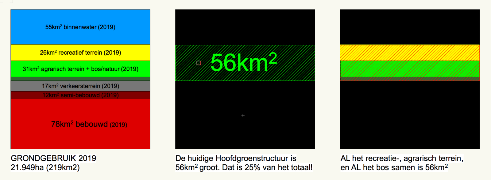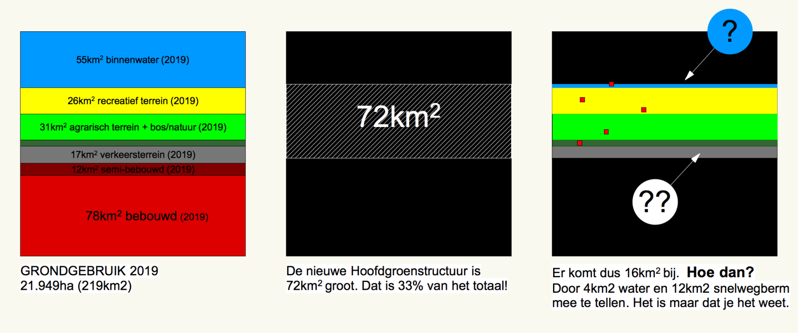 Het wordt gekker als we de claim van 72 km2 onderzoeken. Dat is een abstract getal en een toename van 56 naar 72 km2. Dat klinkt als een klok, maar als we het grafisch relateren aan het totale grondoppervlak dan zien we dat dit alleen kan als er water en verkeersterrein wordt meegeteld. Dat blijkt ook uit de gedetailleerde vergelijking die later wordt gemaakt, waarin per groentype de huidige en de toekomstige HGS wordt vergeleken.