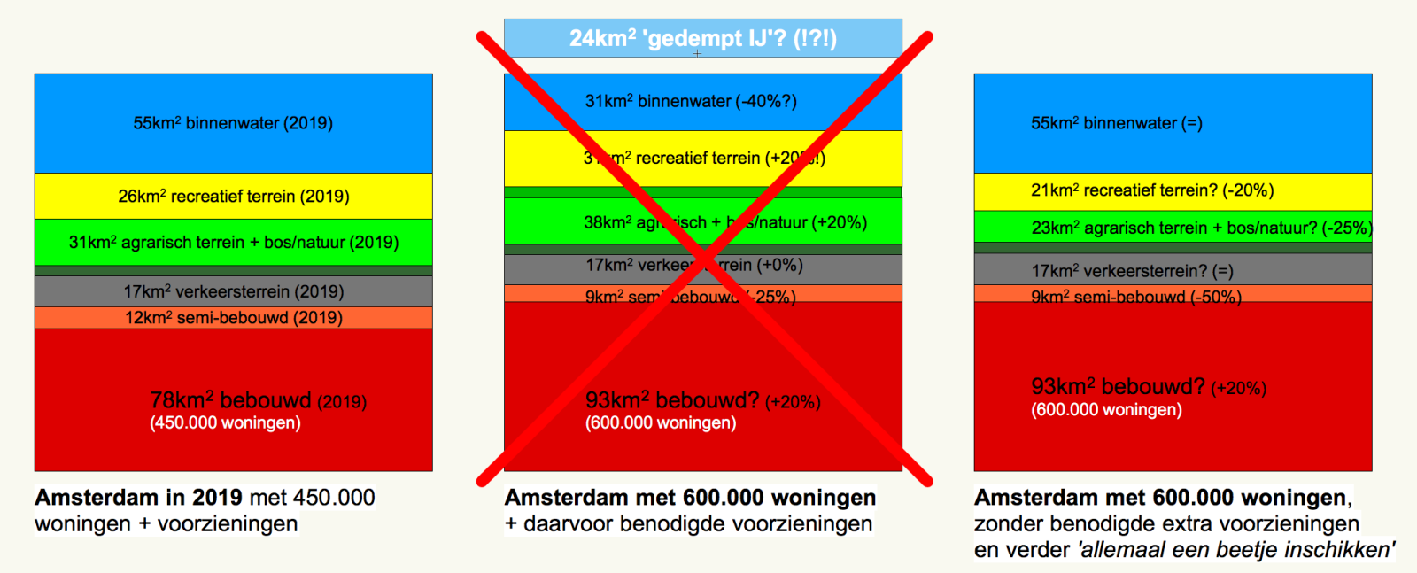 Het wordt NOG gekker als we ons realiseren dat Amsterdam minimaal 150.000 woningen bij wil bouwen, bovenop het bestaande aantal van 450.000 woningen. Voor al die extra woningen heb je ook extra grond nodig, extra wegen, extra groen, extra recreatieterrein. Dat ziet er dan zo uit als op onderstaande afbeelding. Links het bestaande areaal met 450.000 woningen. In het midden het benodigde areaal als je 33% bebouwing toevoegt. Rechts is te zien hoe de gemeente Amsterdam het wil aanpakken: ‘allemaal een beetje inschikken’.